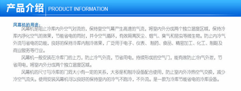 风幕机创造舒适室内环境 产生高速气流,当空间大而产生空调能量分配不均时,可借风幕机空气循环系统功能到室内温度均衡,将室内外分成两个独立温度区域,保持室内温度,净化空气,节省电能,促进空气循环。